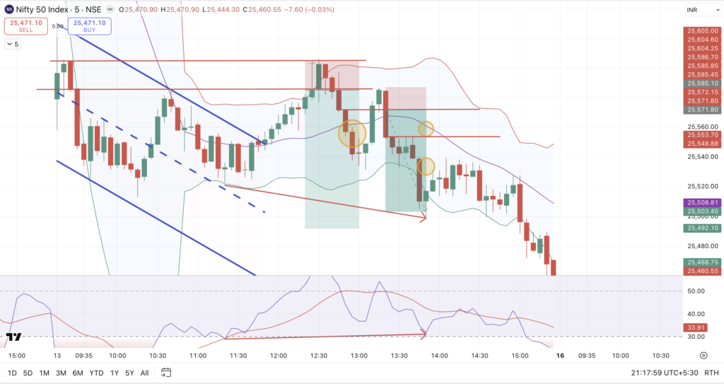 Around 11:50 AM, the index broke out of the descending channel, triggering a recovery attempt. Price then moved toward the 25,600 resistance zone, which had been established in the morning. However, the breakout failed to sustain, and NIFTY retraced back toward the 0.5 Fibonacci level.