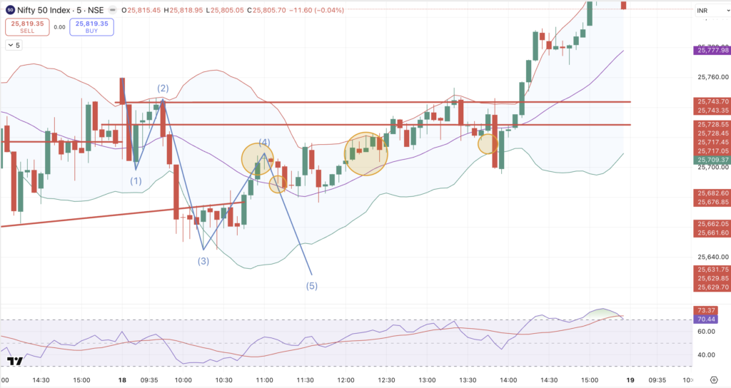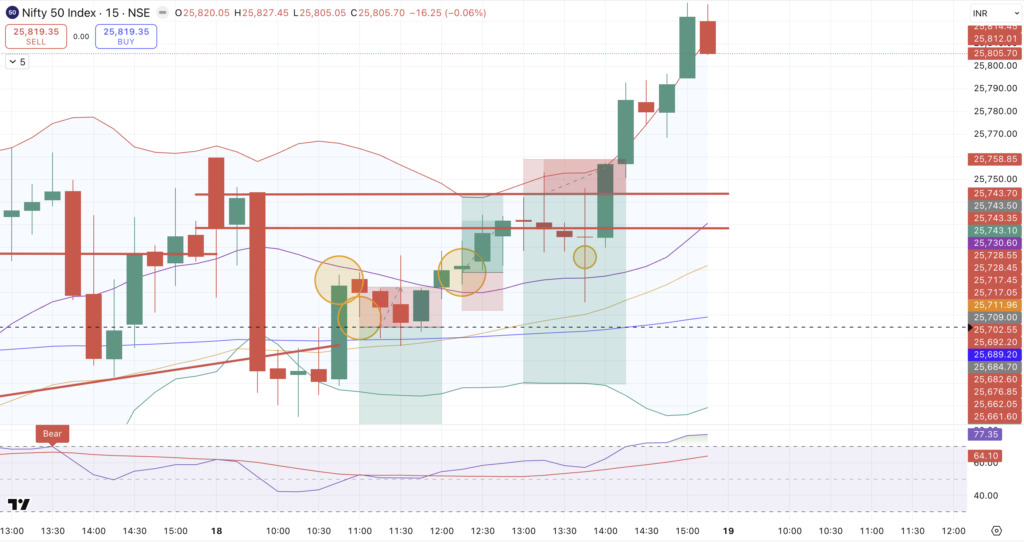 From there, price gradually formed a rising channel, showing consistent higher lows. Around 1:50 PM, the index dropped nearly 50 points, but the very next candle reversed sharply, absorbing the decline. This marked a shift in intraday control.